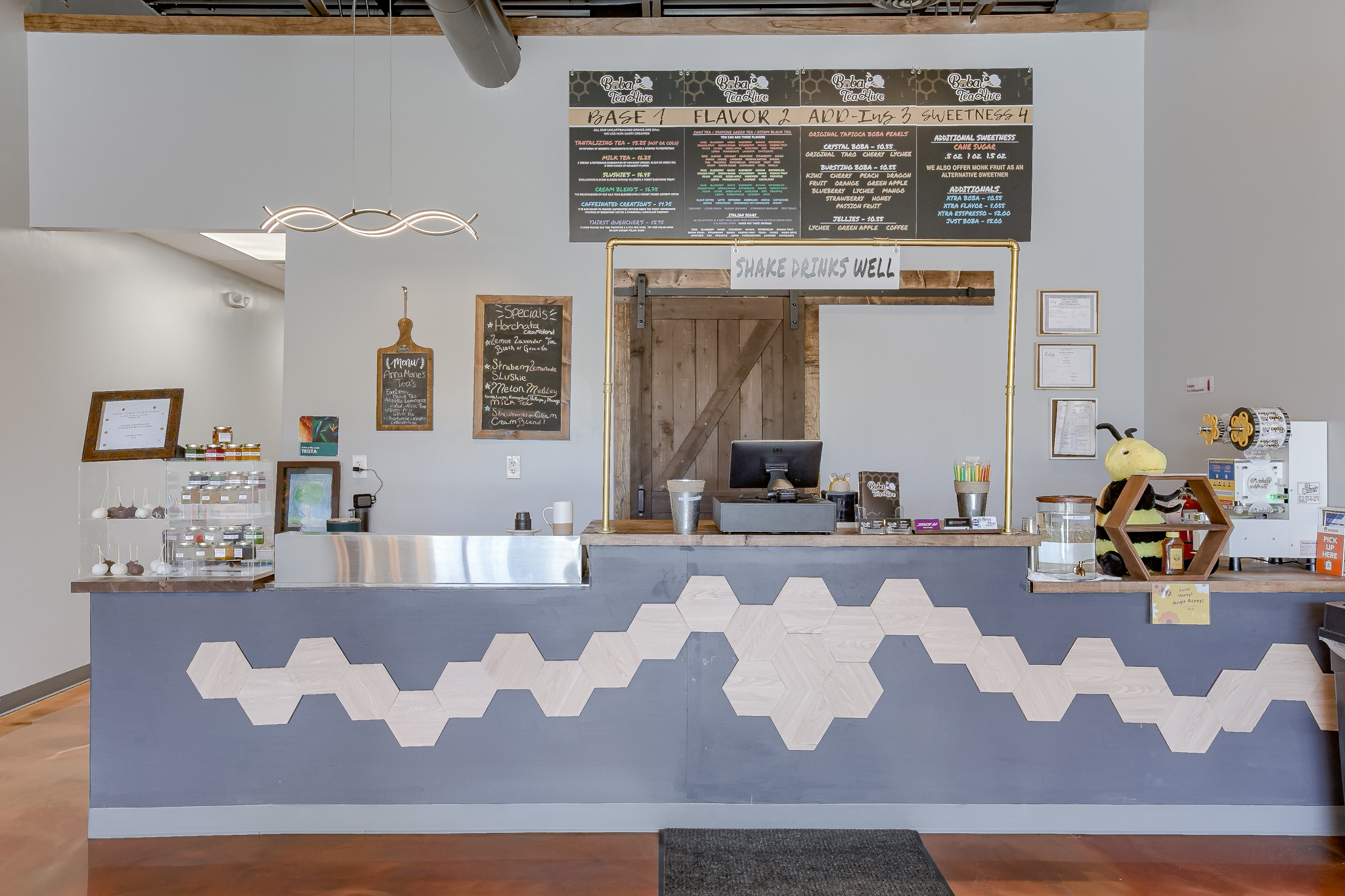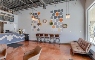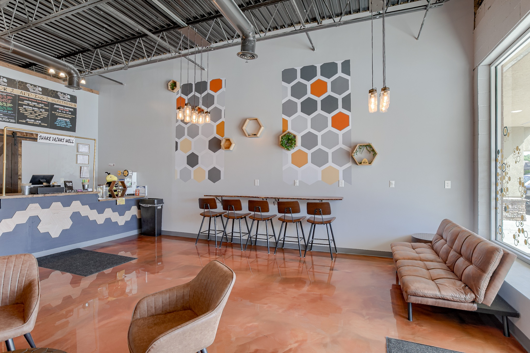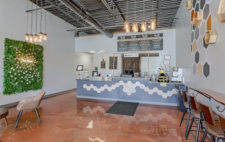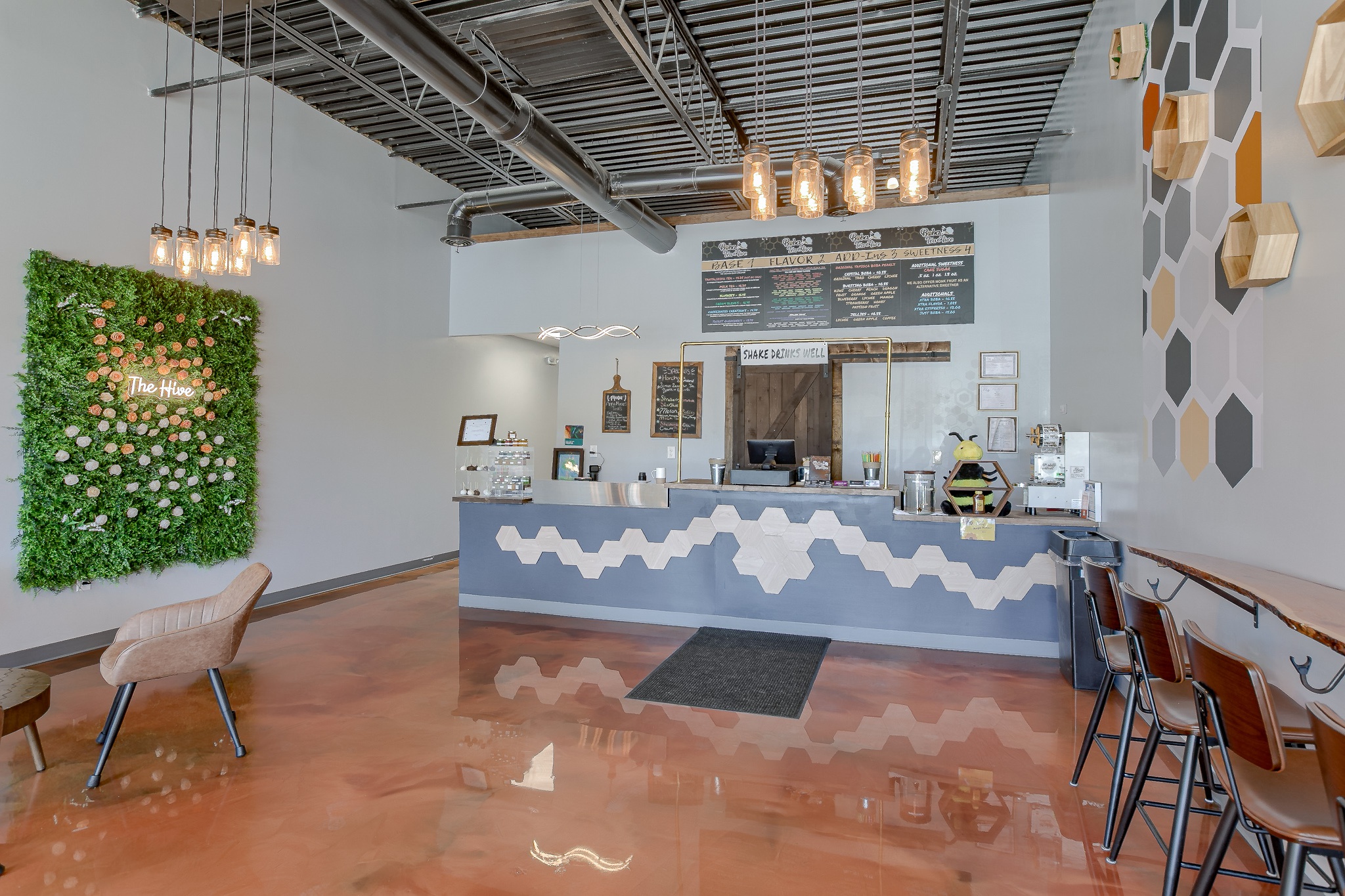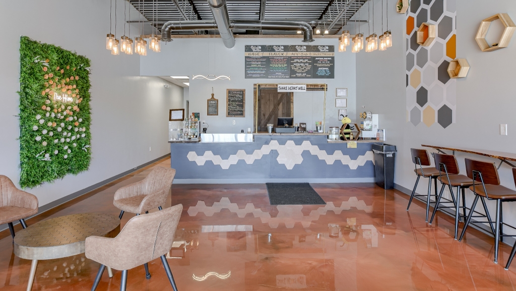 Located in Liberty Crossroads Shopping Center, Boba Tea Hive is Liberty’s coolest new place for a tasty dessert drink. The interior is beehive-themed utilizing the classic beehive hexagon in various ways. A variety of seating options accommodate groups, couples, and single patrons. Decorative lighting and stained concrete floors give the space an industrial feel while a foliage wall softens the area, bringing the feeling of nature indoors. The workspace available for order preparation is long and narrow. This was a challenge for employees. The owner had created a layout for the kitchen but upon A3G’s post-occupancy consultation, we redesigned the space to minimize the steps needed for tasks and allowed for a more organic workflow. While this work isn’t the “pretty stuff” it adds tremendous value for the business.