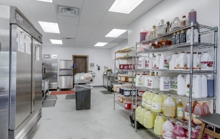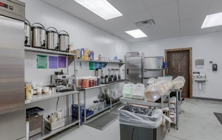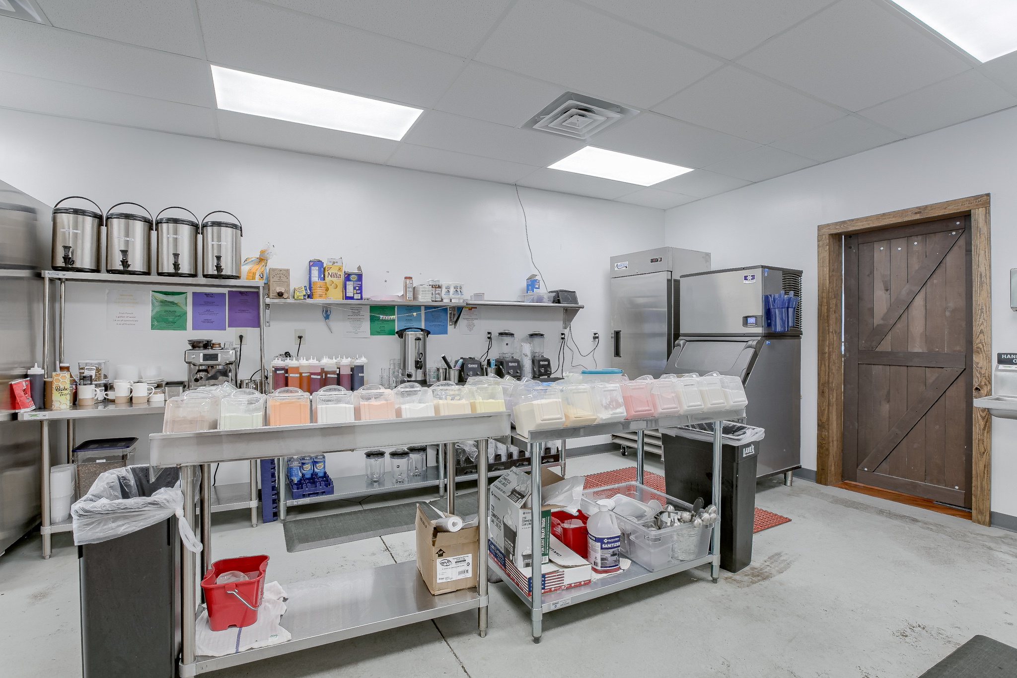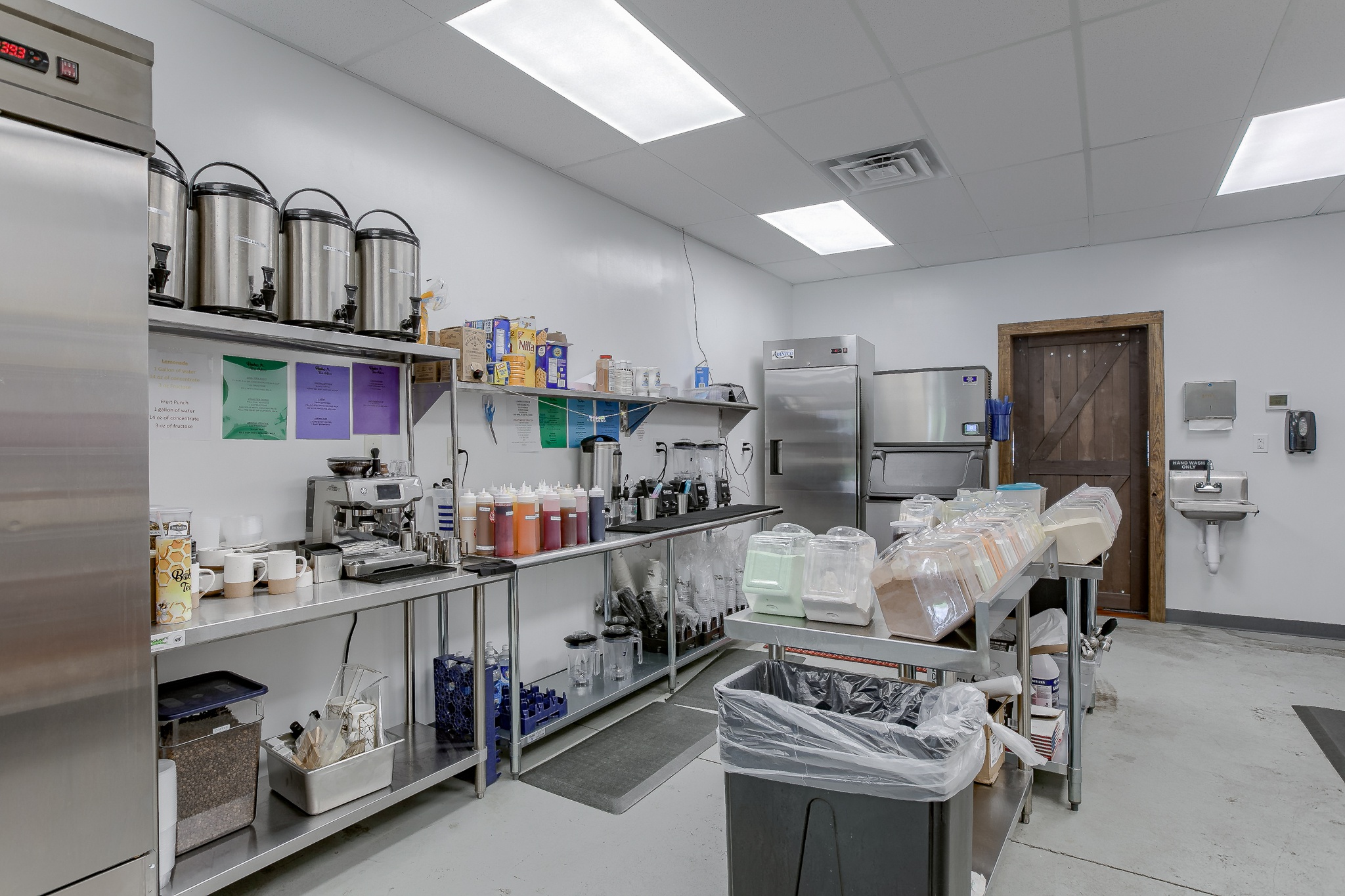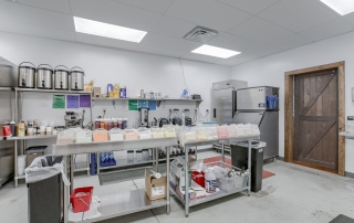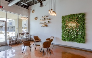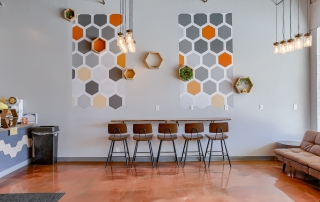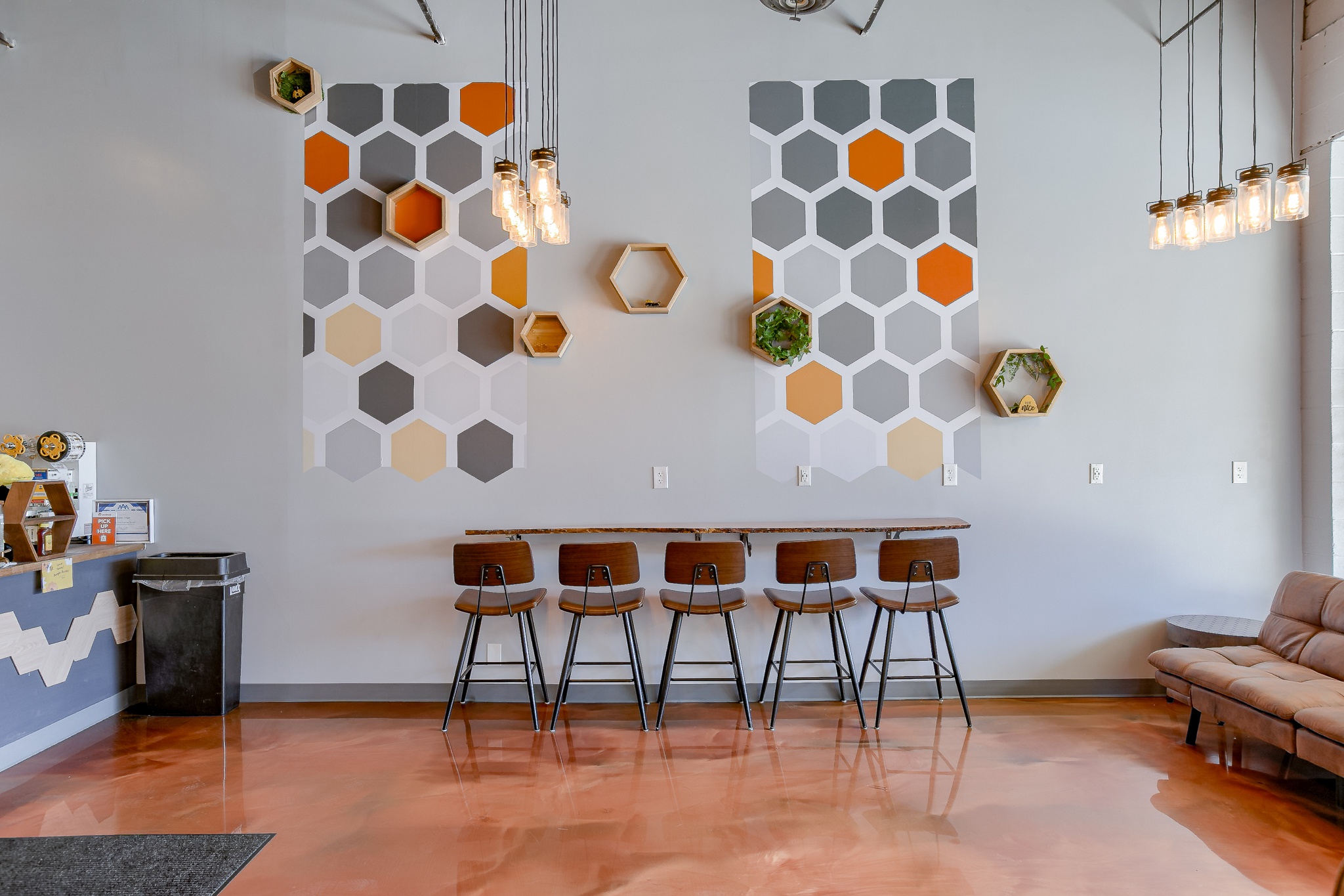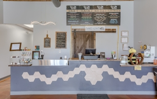 Located in Liberty Crossroads Shopping Center, Boba Tea Hive is Liberty’s coolest new place for a tasty dessert drink. The interior is beehive-themed utilizing the classic beehive hexagon in various ways. A variety of seating options accommodate groups, couples, and single patrons. Decorative lighting and stained concrete floors give the space an industrial feel while a foliage wall softens the area, bringing the feeling of nature indoors. The workspace available for order preparation is long and narrow. This was a challenge for employees. The owner had created a layout for the kitchen but upon A3G’s post-occupancy consultation, we redesigned the space to minimize the steps needed for tasks and allowed for a more organic workflow. While this work isn’t the “pretty stuff” it adds tremendous value for the business.