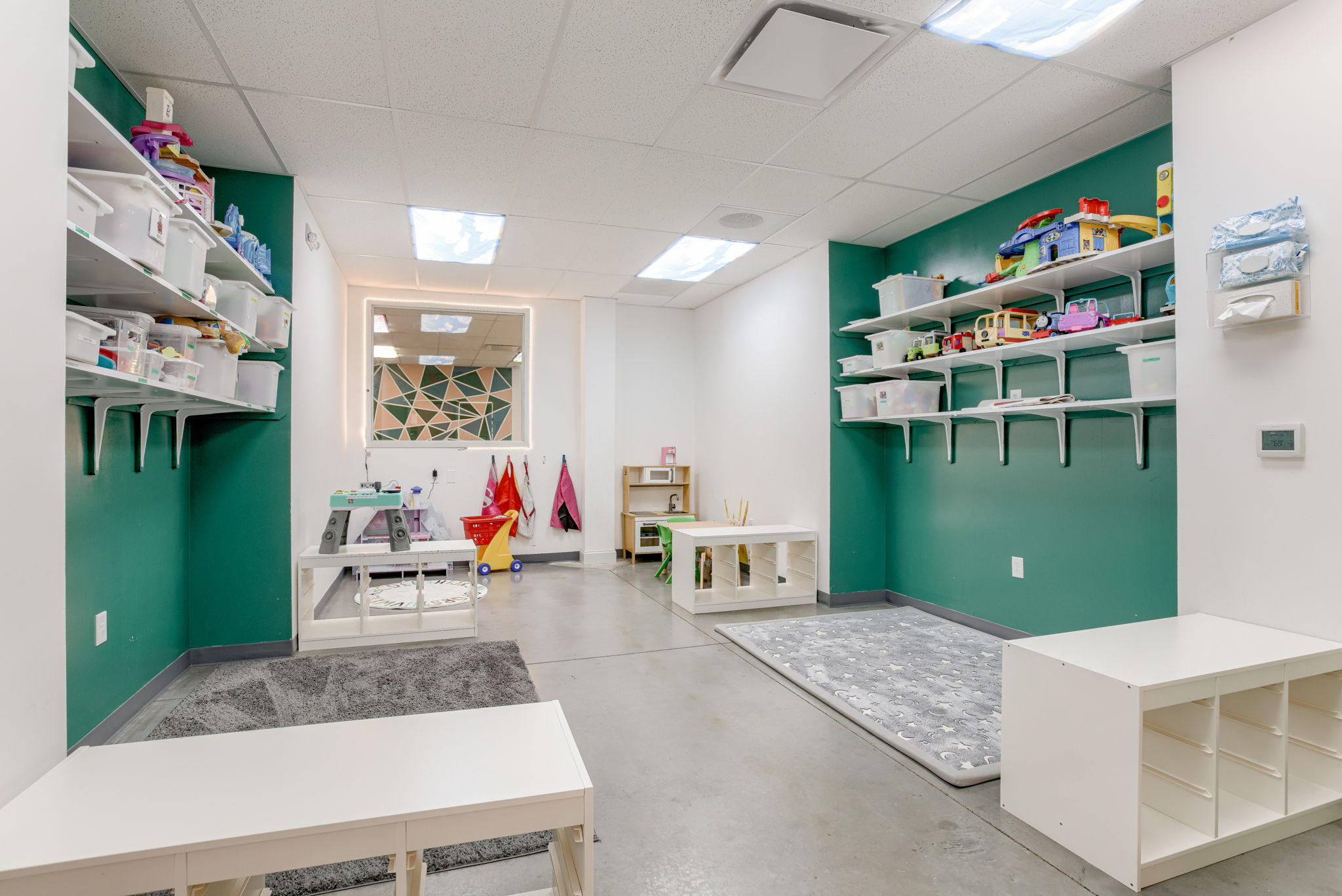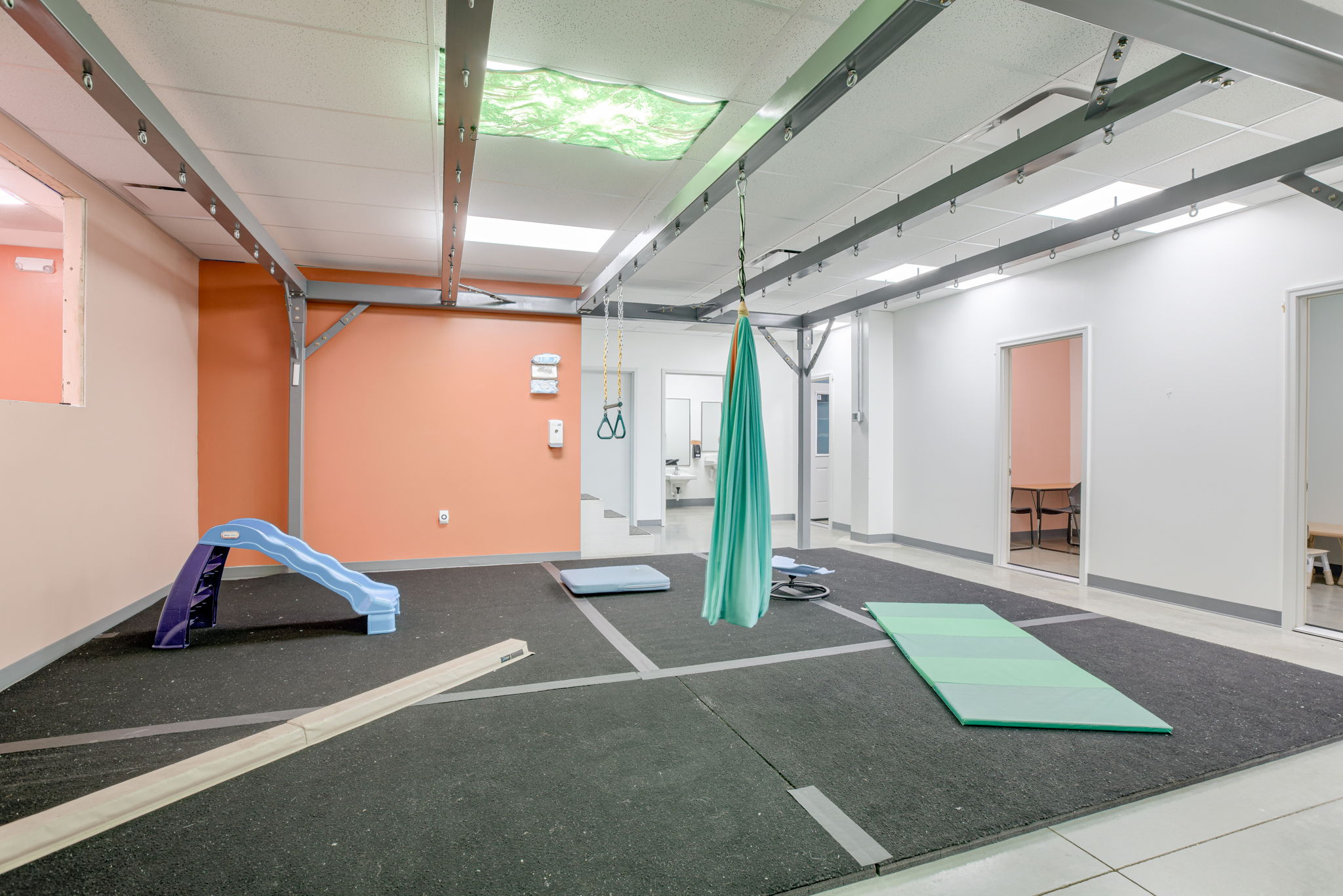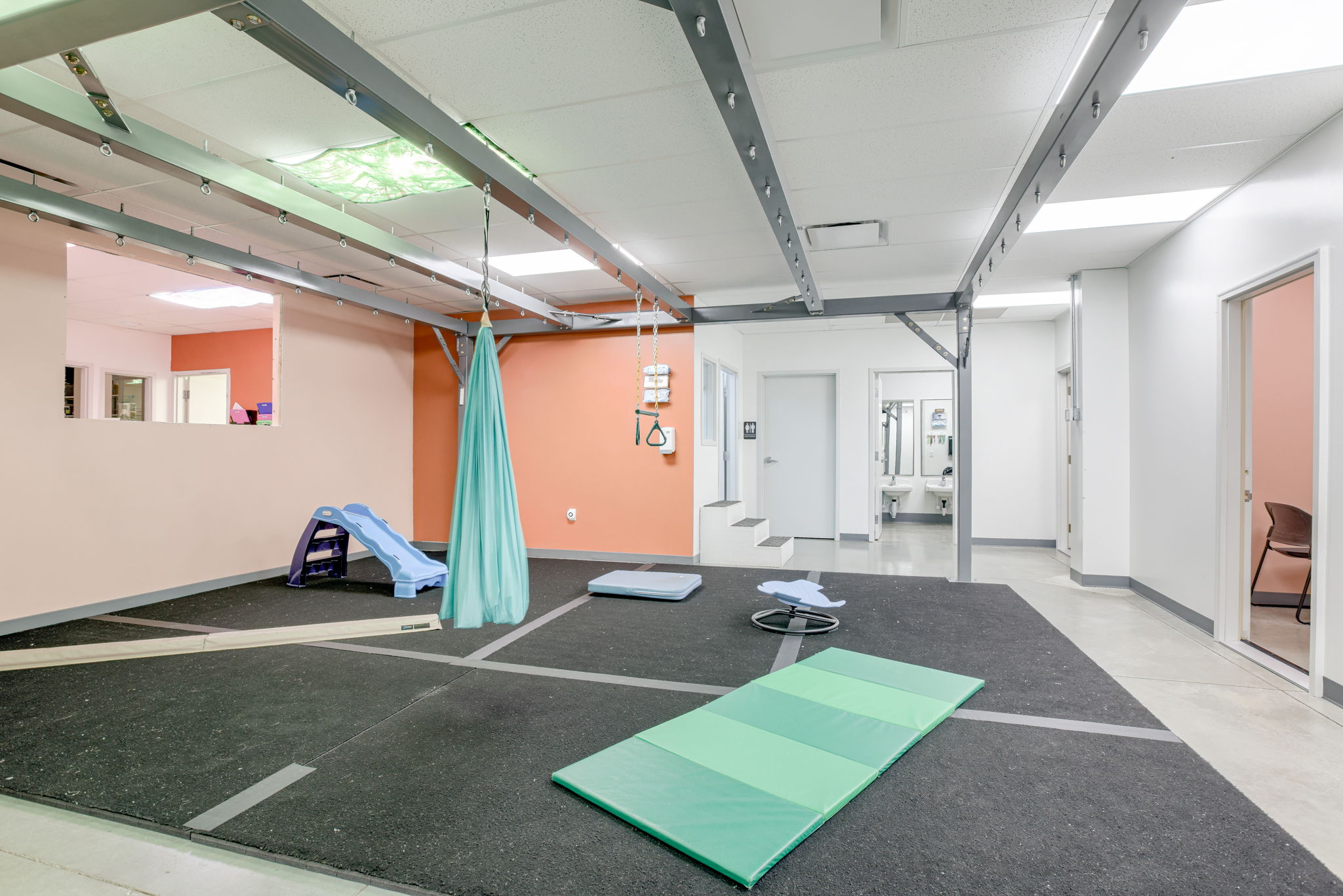 A3G provided tenant finish design for Theraplay Pediatric Services, transforming an existing shell building into a welcoming, functional space for comprehensive pediatric therapy. The facility offers individual and group services in speech, occupational, physical, and behavioral therapy. Thoughtfully designed spaces support both staff and client needs, including a parent training room to help caregivers better understand and manage behavioral challenges. The layout features two speech and language training rooms, a gym for physical therapy, private treatment rooms, a breakroom, and ample storage. An open office area promotes collaboration among staff. The result is a well-organized, supportive environment that enhances Theraplay’s mission of helping children reach their full potential through personalized, multidisciplinary care.