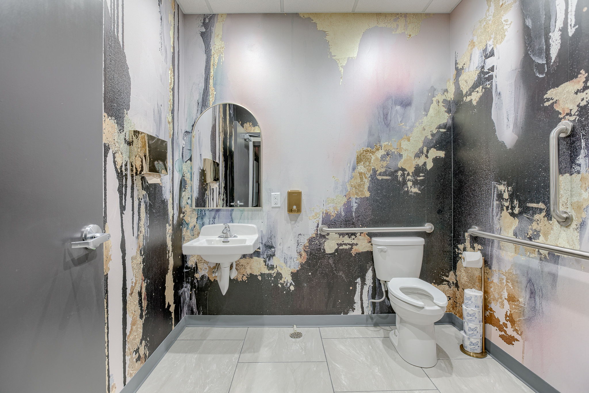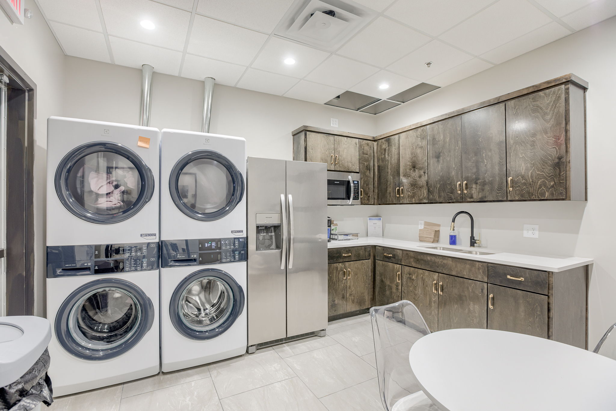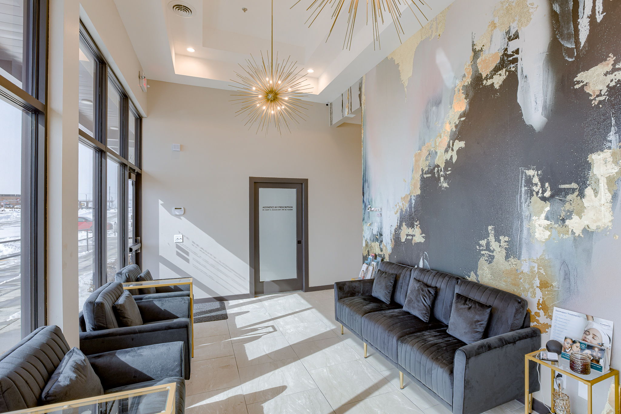 The Beauty Lounge KC is a woman-owned salon redefining luxury with 14 individual suites in a modern, all-in-one beauty destination. A3G Architects transformed the 2,400 SF warm shell into a sophisticated space featuring a welcoming lobby, breakroom, restrooms, and utility room. Each 10’x10′ suite includes casework, a shampoo bowl or hand sink, and serves as a customizable canvas for stylists and aestheticians. The design blends elegance and function with gold Sputnik chandeliers, emerald and white marble wallcoverings, concrete-look porcelain tile, and warm gold accents throughout. Dark wood cabinetry with sleek hardware adds a refined, practical touch—creating a space that’s both upscale and user-friendly.