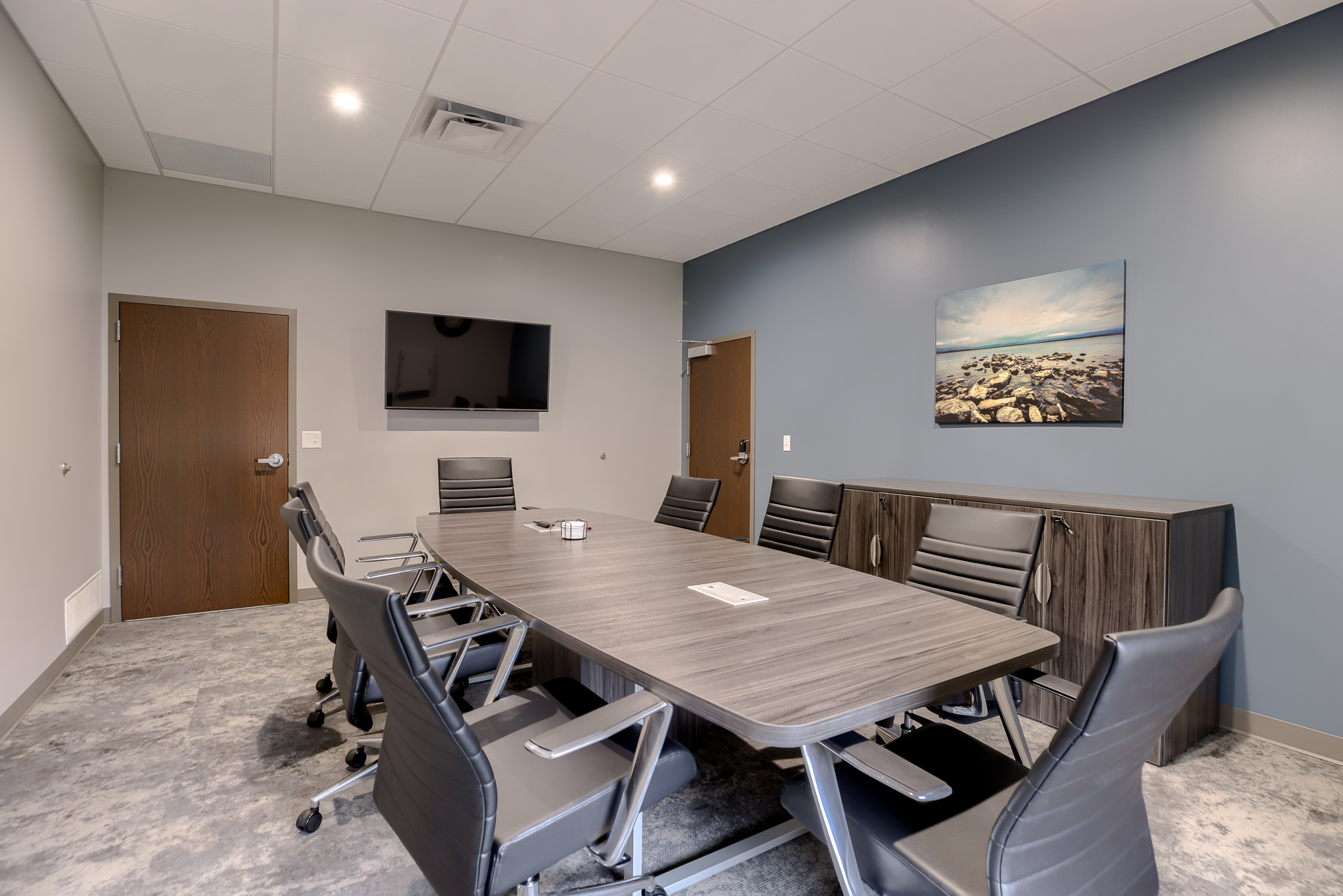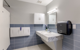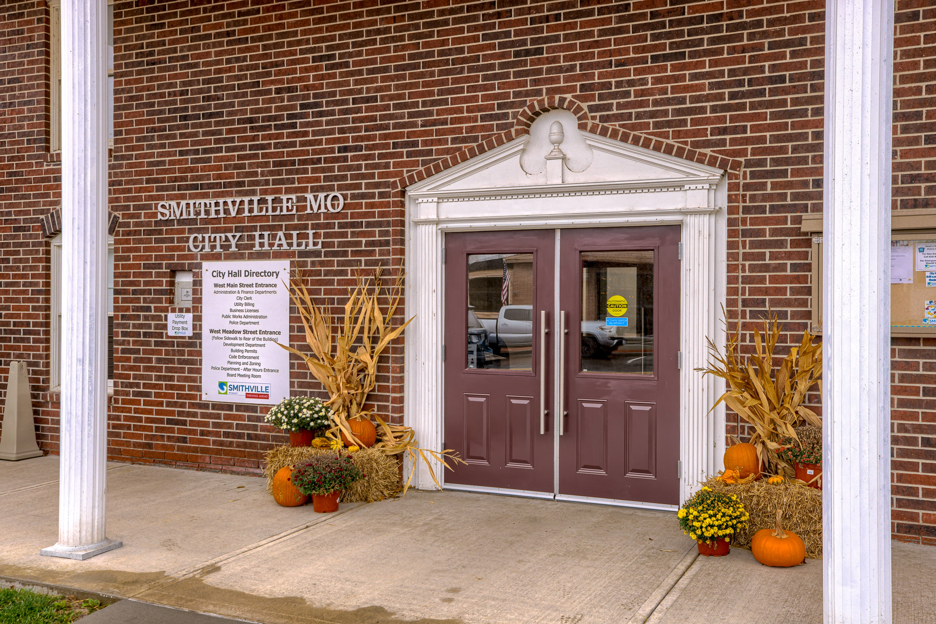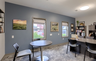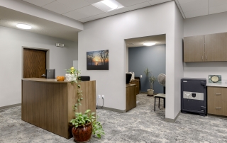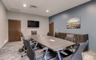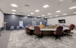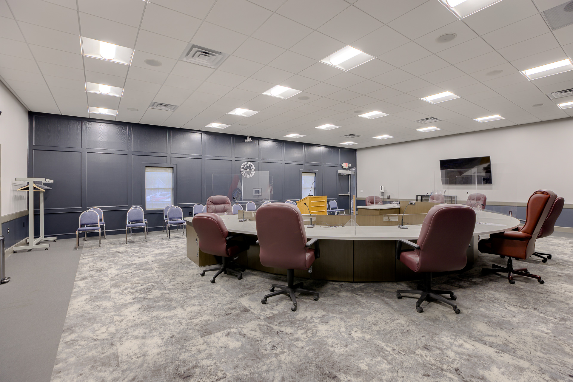 The Smithville City Hall Council Chamber was a multi-use space connected to the Police wing, the Administration wing, the two restrooms, and staff break room. This created noise and sightline issues that were disruptive when the space was in use. The space also had high ceilings and hard surfaces making for a very loud meeting space. We created a separate corridor allowed the traffic to flow throughout the building without coming through the Council Chambers. The room was larger than necessary, so adding this corridor did not reduce functionality. A large closet to store additional furniture to allow various configurations in the main Council Chambers so it can easily serve multiple functions. Adding a lower acoustical ceiling and soft recycled plastic flooring helped reduce noise.