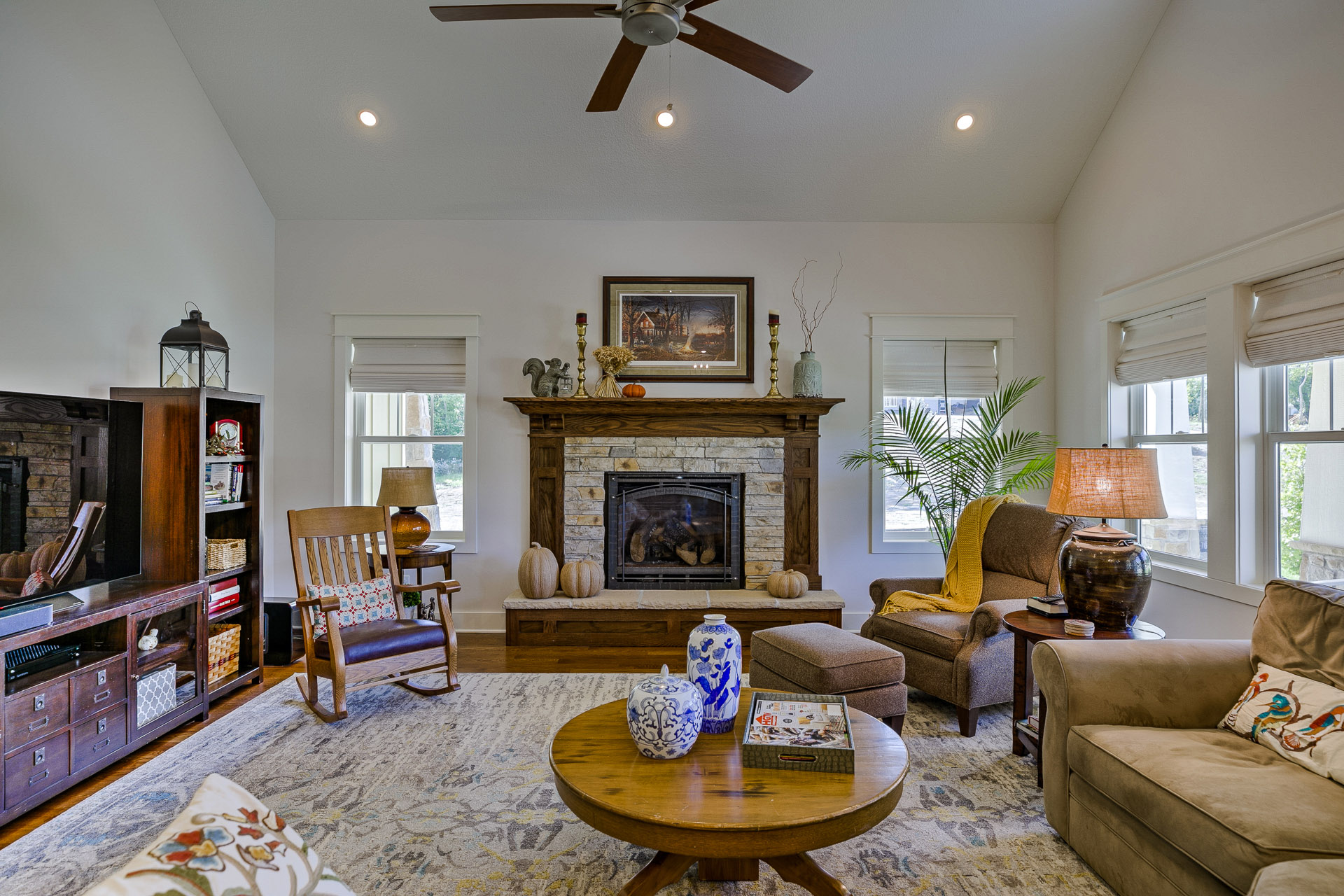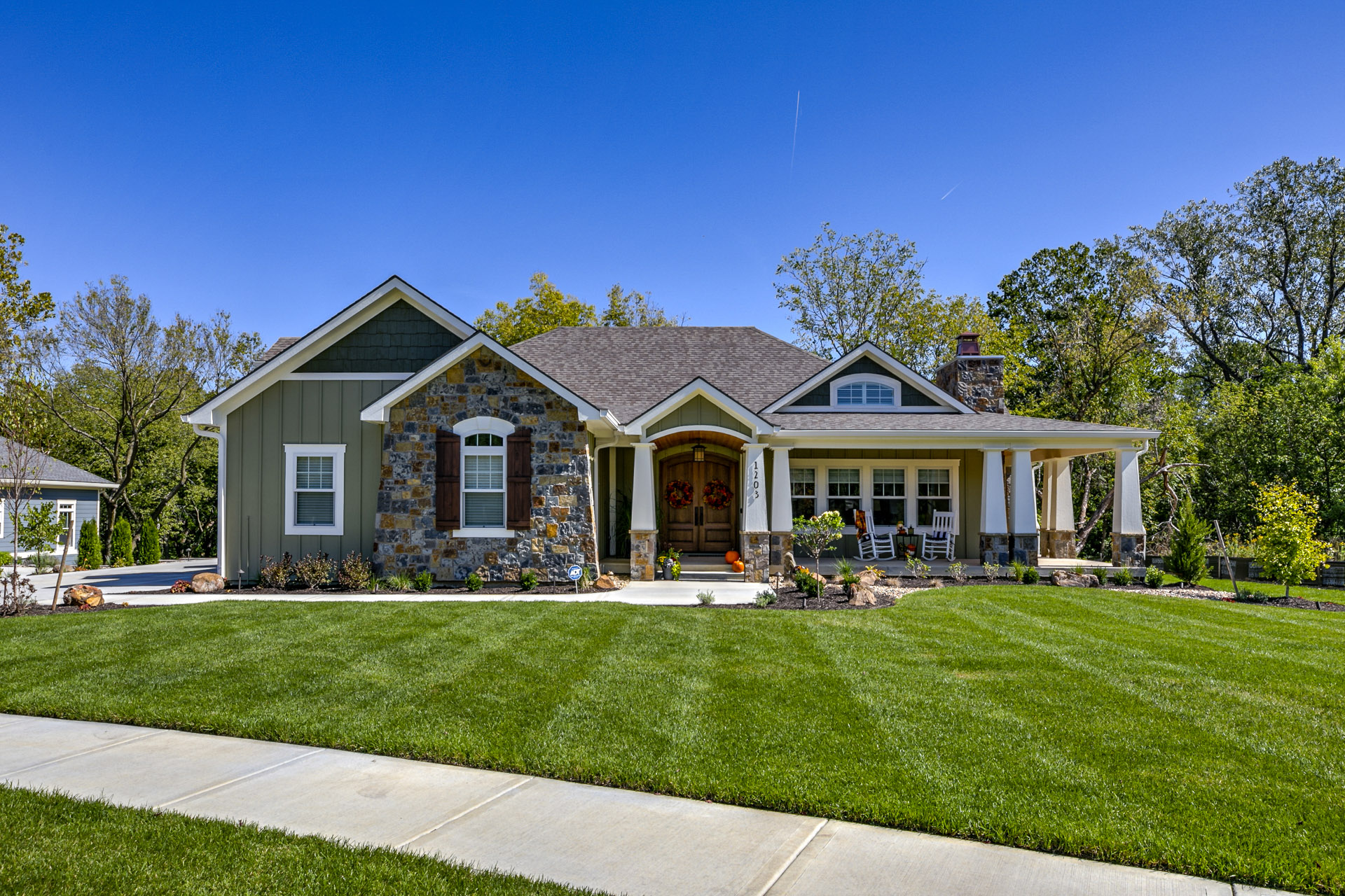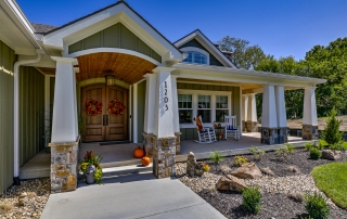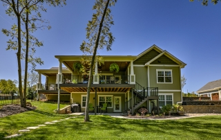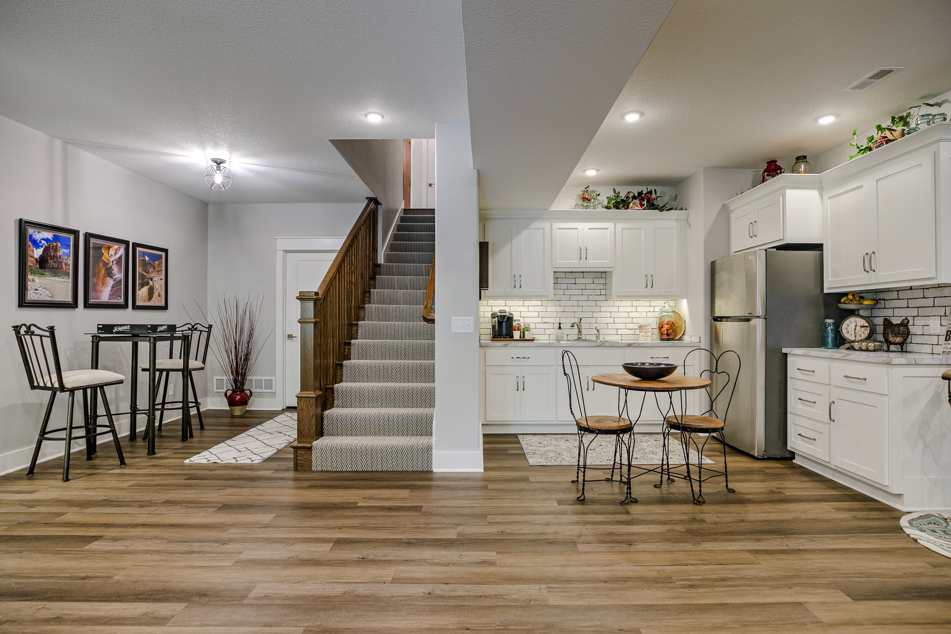 This home’s wrap-around front porch with barrel vault cedar-finished ceiling is an unexpected luxury, giving visitors an idea of the finishes inside. Upon entering, guests first experience the high ceilings and cozy feeling, ending with the soft finishings contrasted with traditional warm oak wood in the flooring and in the mantle above the stone fireplace. The contemporary kitchen is fixed with an island breakfast bar and modern light fixtures throughout. The main floor is home to the primary suite, two bedrooms and 2.5 bathrooms. The basement is fully finished with two bedrooms and one full bath, a wet bar wrapped in a subway tile backsplash, and a large entertainment area.