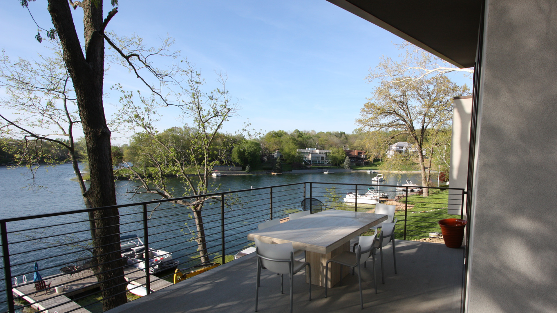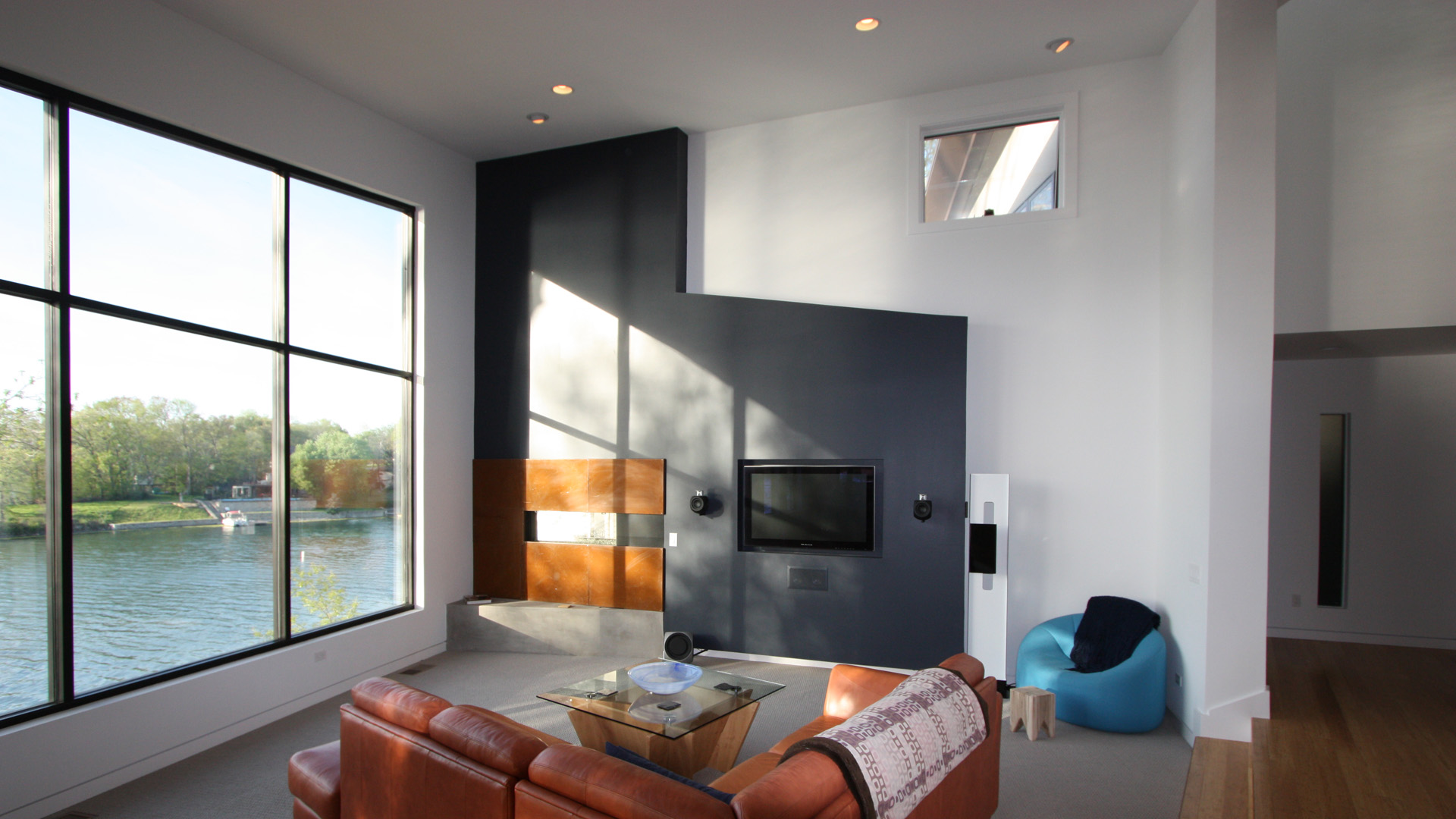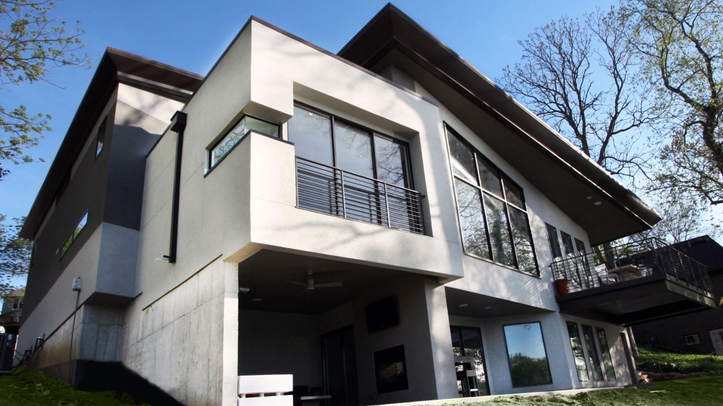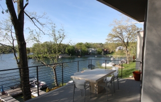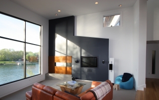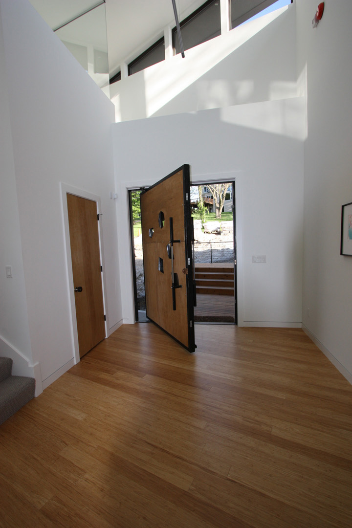 This contemporary lake house was the vision of the owners from the start. The stucco exterior is clean lined with overlapping planes and floating surfaces. Primary views of the lake were established for each space and the rooms focused around those views. Entrance is through the 6’x8’ custom designed Corten steel pivot door and on to a bamboo landing. The open plan and stepped levels create a variety of spatial experiences within the same large volume. The lowest level of the home provides another sunken family room and an outdoor living space that opens up to the airy lake.