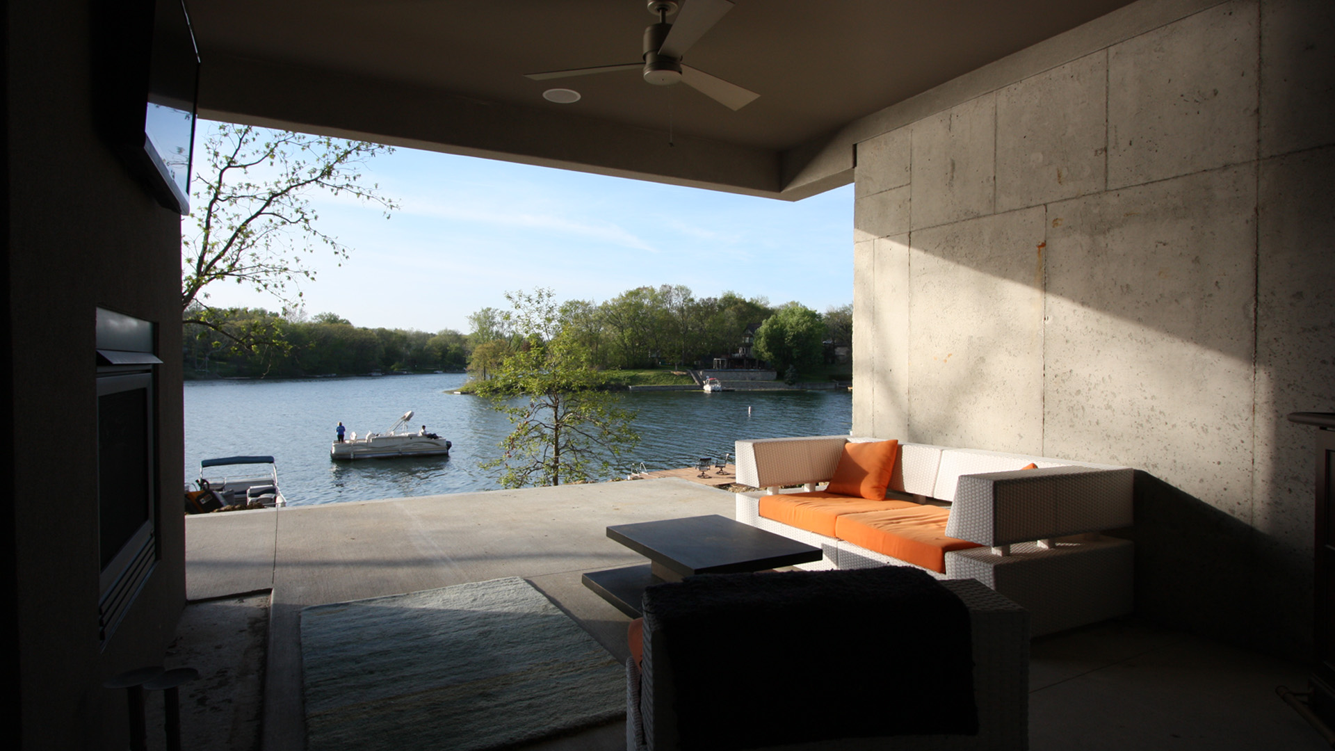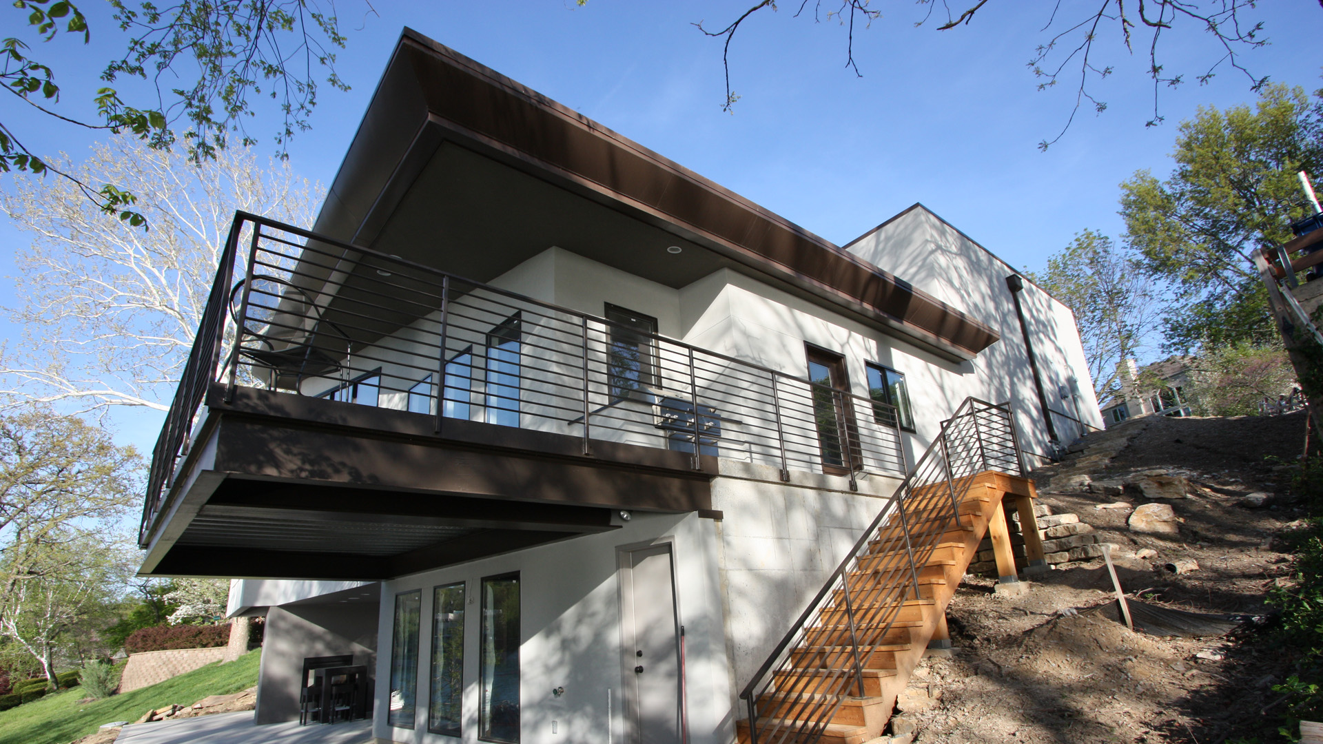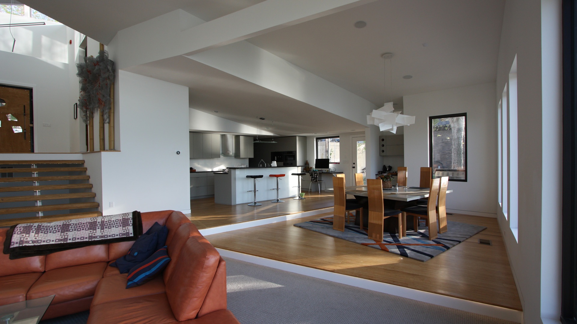 This contemporary lake house was the vision of the owners from the start. The stucco exterior is clean lined with overlapping planes and floating surfaces. Primary views of the lake were established for each space and the rooms focused around those views. Entrance is through the 6’x8’ custom designed Corten steel pivot door and on to a bamboo landing. The open plan and stepped levels create a variety of spatial experiences within the same large volume. The lowest level of the home provides another sunken family room and an outdoor living space that opens up to the airy lake.