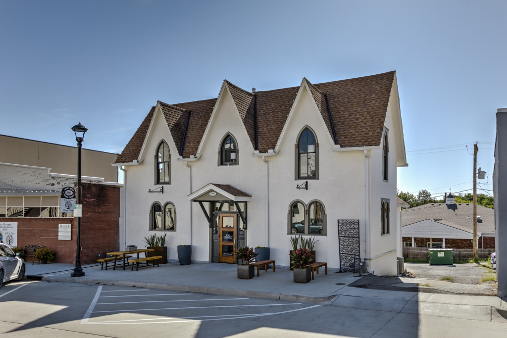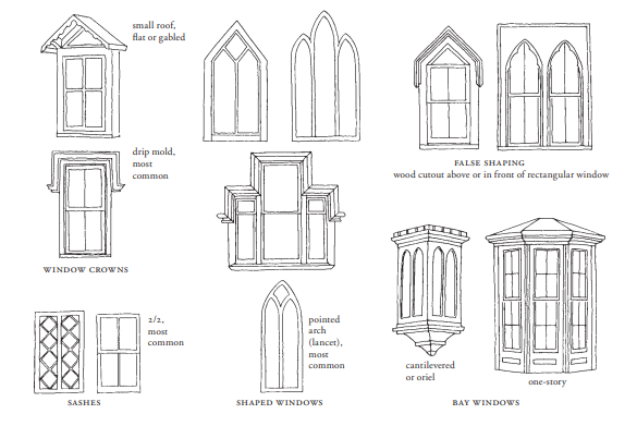 A dominant feature of most homes built during the Gothic Revival is detailed ornamentation. The windows are historically arch or lancet (a pointed arch) and are ganged together in pairs. Doors would be simple, but heavily adorned with trim. A gable roof or crown above the door, and heavy window crowns provide interest and the gothic detailing to the façade. Vergeboards, or decorative gable trim, with thin finial help to date the decade the home was built. Pre-1860 the vergeboards typically incorporated the finial and were more ornate, while post-1860 it was typical for vergeboards to appear simple with cross bracing. Check out the historical photograph of our building below to see an example of gothic detailing.