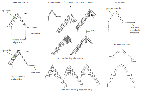 Three Gables Architecture is easily identifiable as there is a central gable above the entrance, and an identical gable mirrored to either side. Typically, the roof is steeply pitched with thin, long windows extending into each gable. The layout of the interior is mirrored about the central gable as well. The front entrance opens into a hall with an ornate stairway to the sleeping area above. The purpose of the Three Gables becomes evident on the second story; the gables increase the ceiling height for more usable space in this area. Depending on the size of the building, one or two rooms are adjacent to the hall on each side. This style of architecture is a rare phenomenon of the Gothic Revival period between 1840-1880.