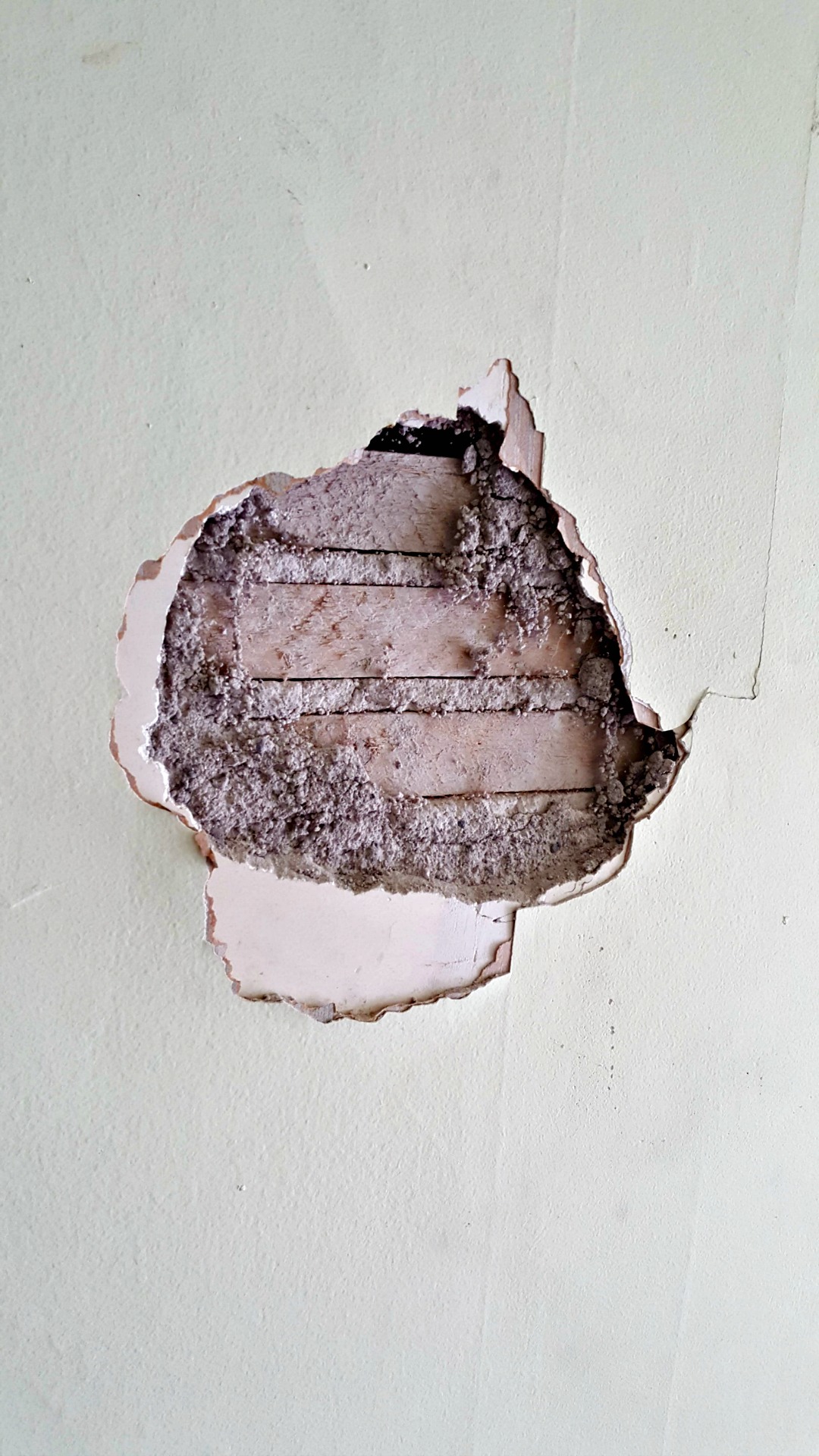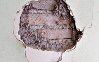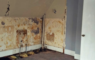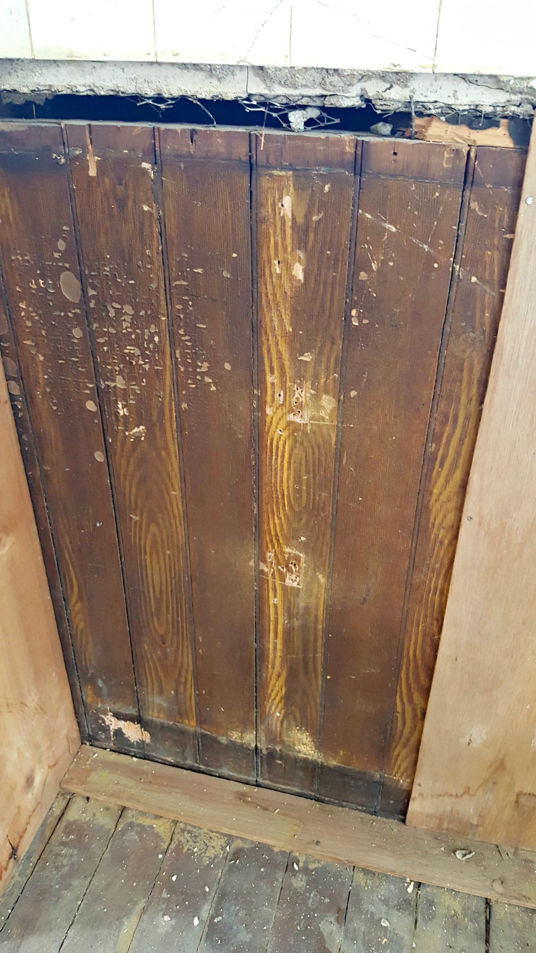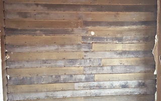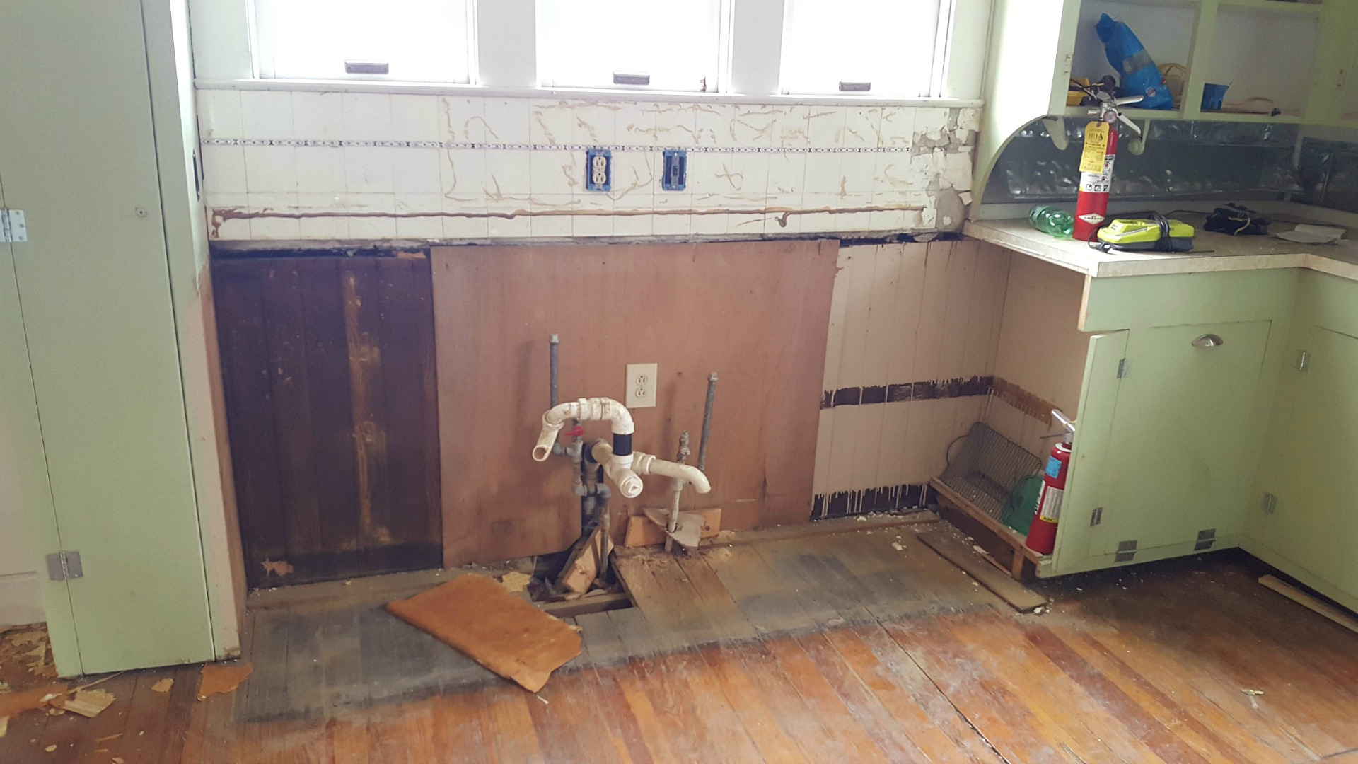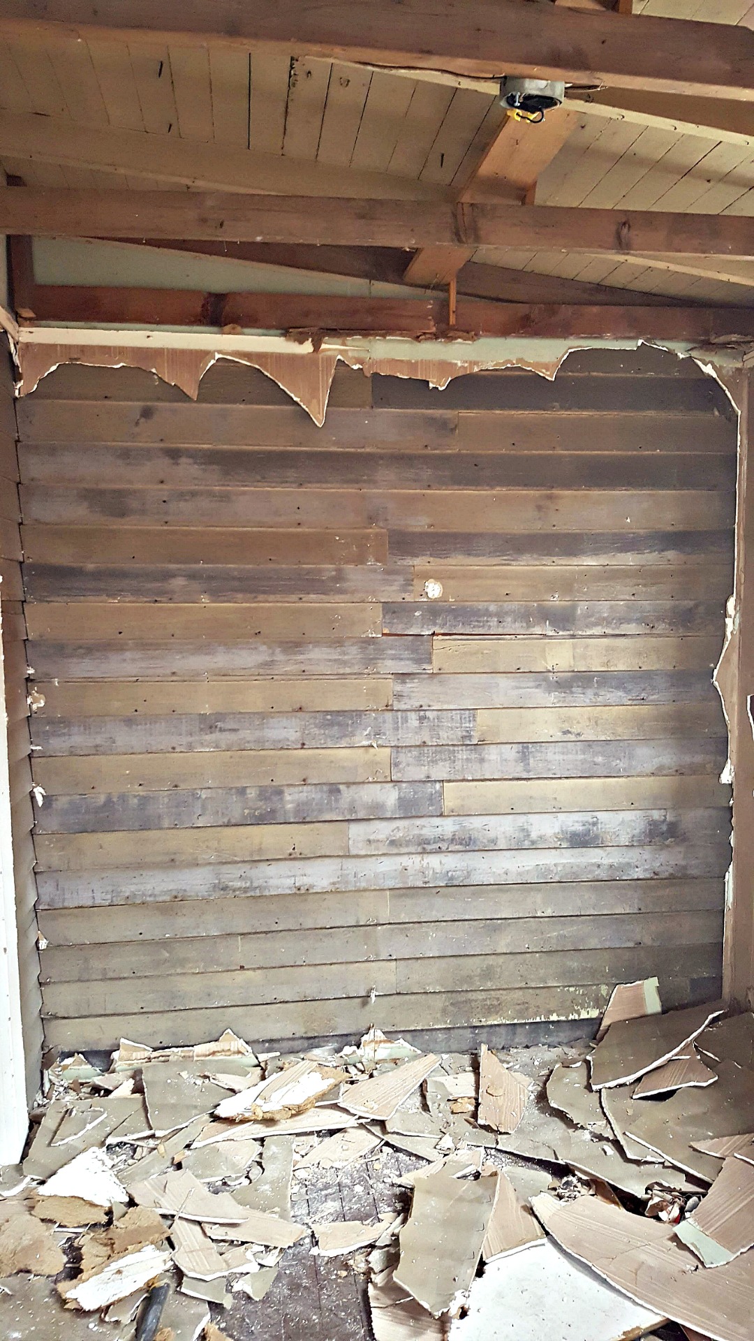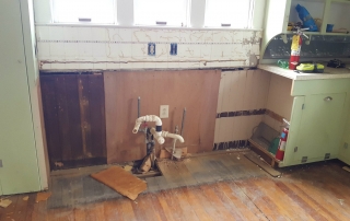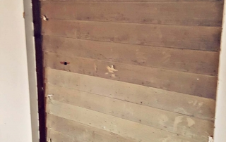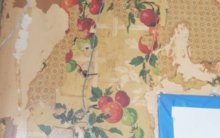 The plaster surrounding an old chimney in what will be our studio space was badly damaged and falling off. Removing this left us with a stunning focal point in our new space. Behind the old paneling in the back porch we’ve uncovered the original lap siding, which will now serve as a backdrop in our materials library. Old wallpaper and tile were uncovered in the kitchen. These items won’t be saved as they are, but will be salvaged to be used as art in the new break room.